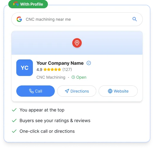 Google Business Profile (formerly Google My Business) is a free tool from Google that lets your business appear on Google Search and Maps. When someone searches for manufacturers near them, your profile shows up with your contact info, hours, reviews, and photos — making it easy for buyers to find and contact you.